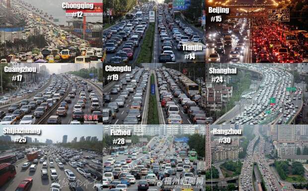 Компания TomTom, занимающаяся навигационными продуктами, недавно опубликовала свой ежегодный рейтинг загруженности городских дорог в часы пик - TomTom Traffic Index. В 2014 году в этот рейтинг впервые были включены города Китая. По оценкам компании TomTom, 10 китайских городов вошли в первую 30-ку мировых лидеров автомобильных пробок. Вот эти города (в скобках занятое ими место в рейтинге):