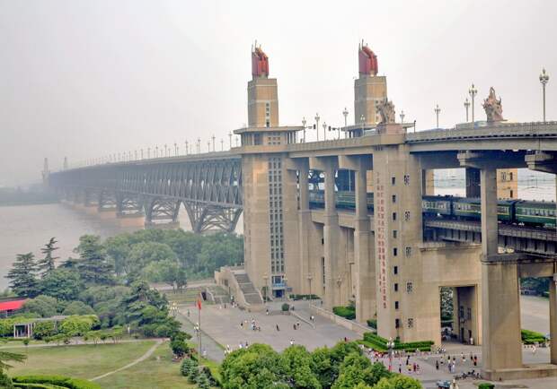 До 1957 года через Янцзы не было построено ни одного моста."Первый мост", его так и называют, был построен в 1957 году в сотрудничестве с инженерами из СССР. Правда, им пришлось уехать, не закончив работу, из-за возникших политических разногласий между нашими странами. Мост двухъярусный - на нижнем ярусе располагается железнодорожная магистраль, на верхнем четырехполосная автострада. Кроме того на мосту находится даже музей, рассказывающий о истории создания первой переправы через Янцзы. Возможно будущий мост в Крым будет в какой-то степени копией этого моста.