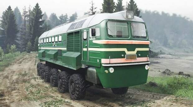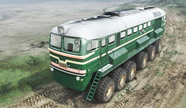 Коломна Мос. обл.) поступил заказ от Министерства обороны на разработки гибридного тягача с использованием вездеходного шасси в совокупности с тяговвыми характеристиками тепловозных дизелей. Вот и был создан такой «ослобык» с шасси МЗКТ и кузовом и начинкой магистрального тепловоза 2Т62У (по-моему, так он называется). Для этого был изуродован абсолютно новый тепловоз.После всех работ по конструировании такого монстра, его смогли завести, но он так и не поехал…были проблемы с системой рулевого управления. В итоге, его из Коломны в Бронницы тащили тягачом, причем последние километры оказались критичными: поворотные колеса встали в раскорячку…короче, кое-как его притащили на полигон, впоседствии военные там с ним что-то колдовали, но в итоге от этой идеи отказались.